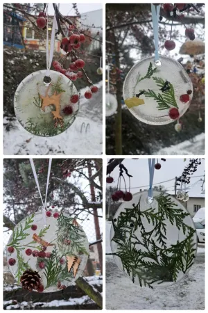 Prvňáčci si při tvoření vyzkoušeli práci s přírodními materiály a mrazem. Jejich ledové ozdoby teď zdobí stromy před školou...